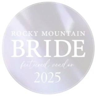 Silver circular badge with white text reading 'Rocky Mountain Bride featured vendor 2025'.