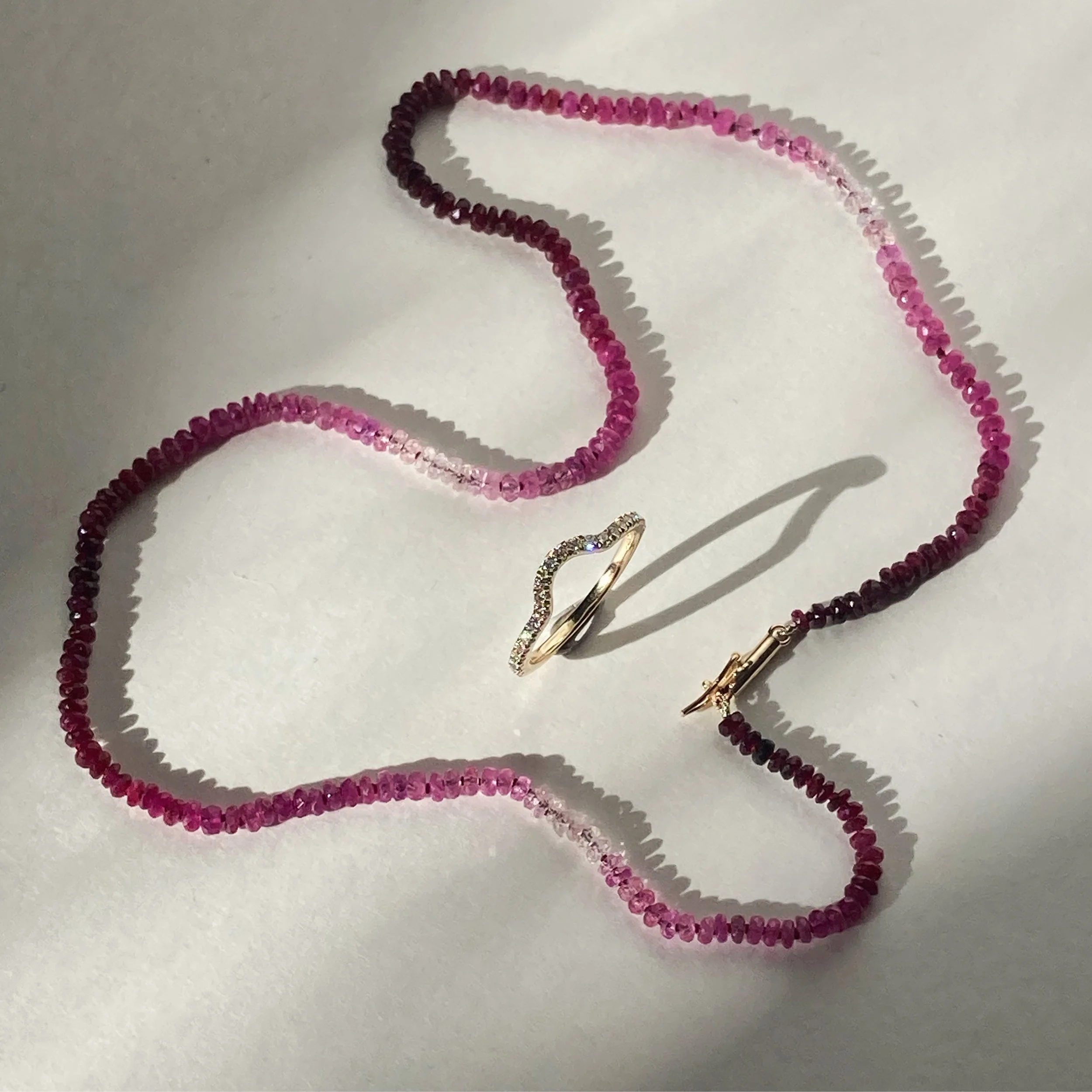 Custom-made ruby beaded necklace and 14k gold ring and diamonds.