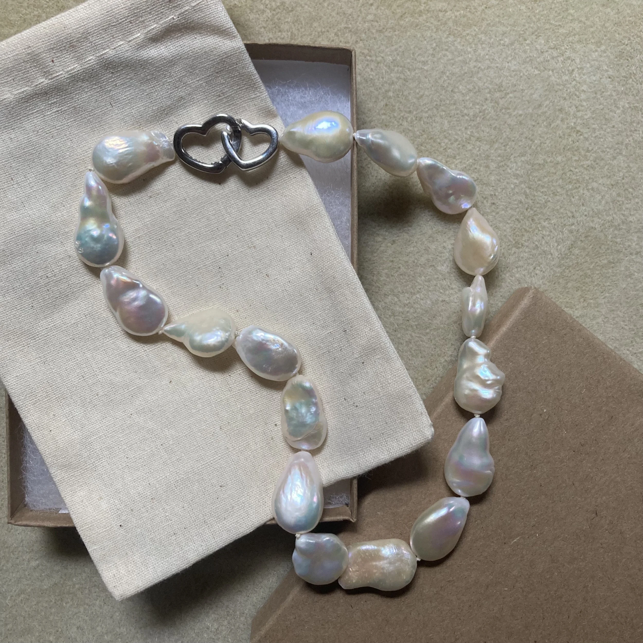 Baroque pearl necklace with heart-shaped clasp on fabric and box