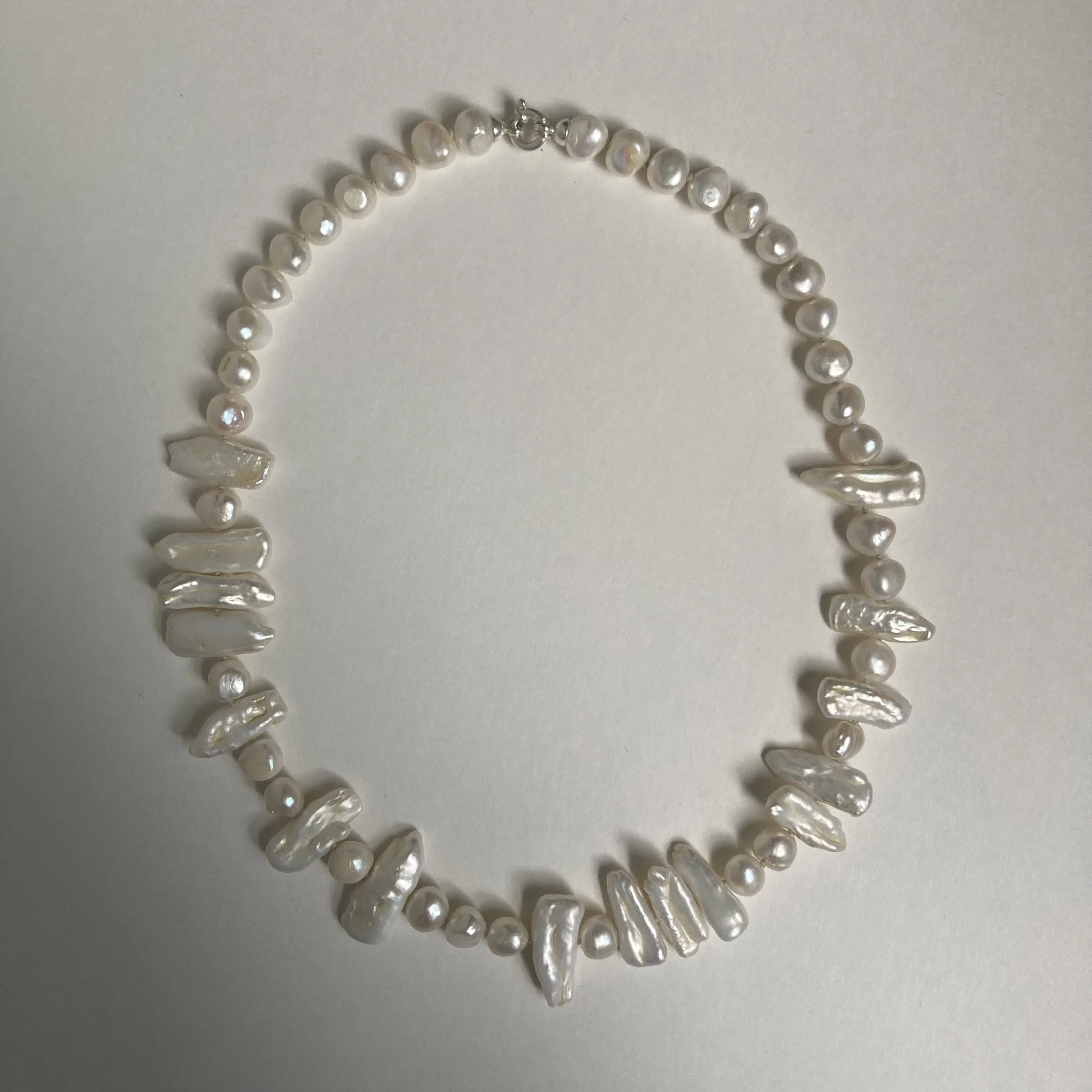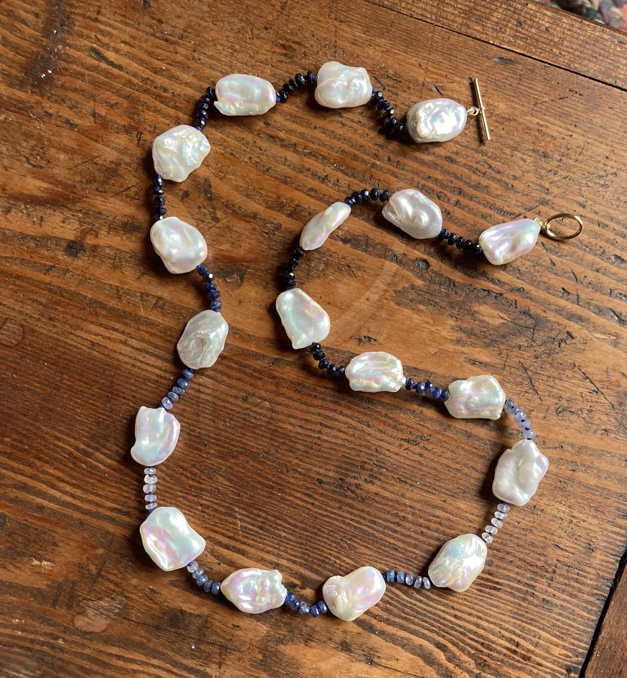 Baroque freshwater pearl and blue sapphire necklace with 14k yellow gold toggle clasp.