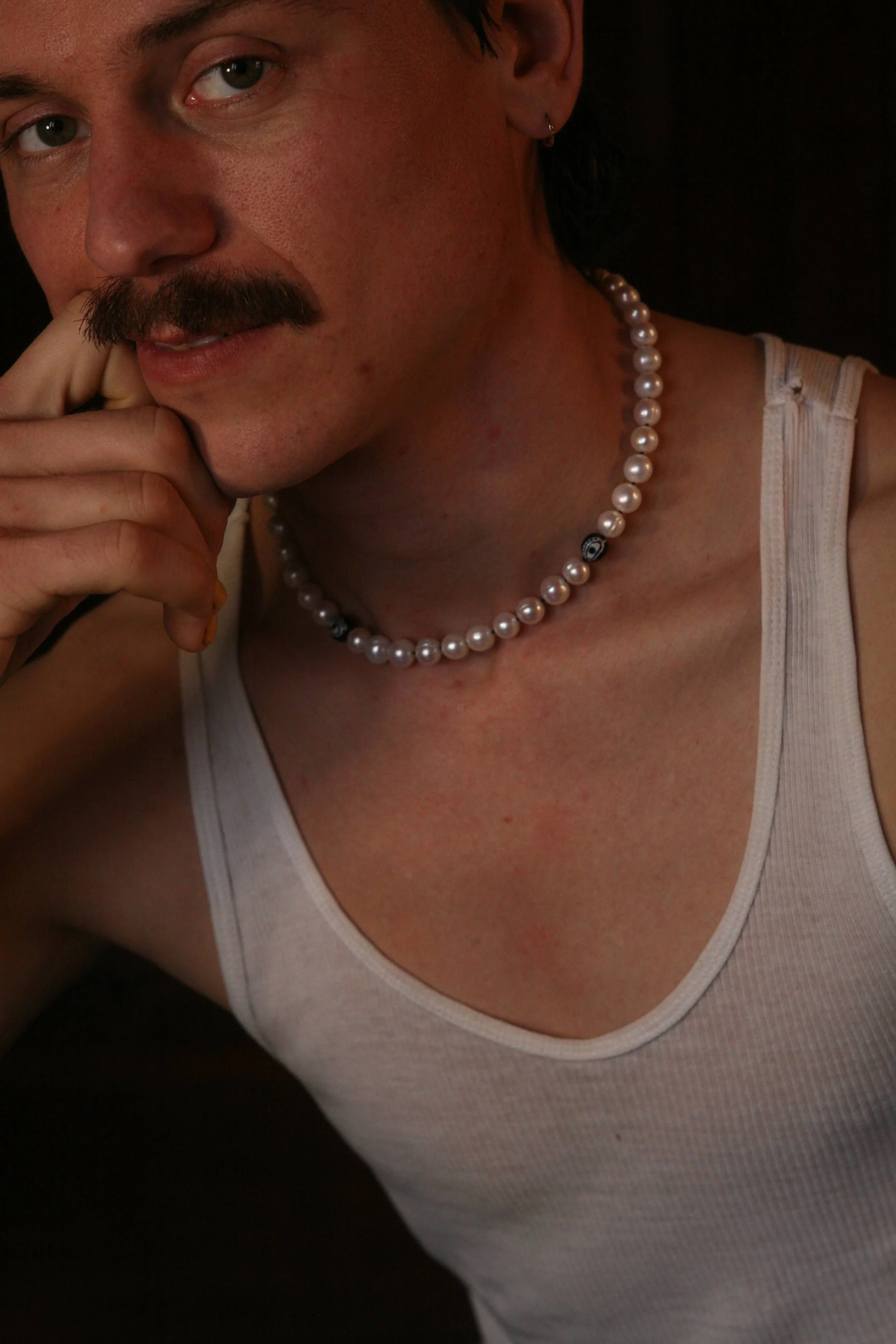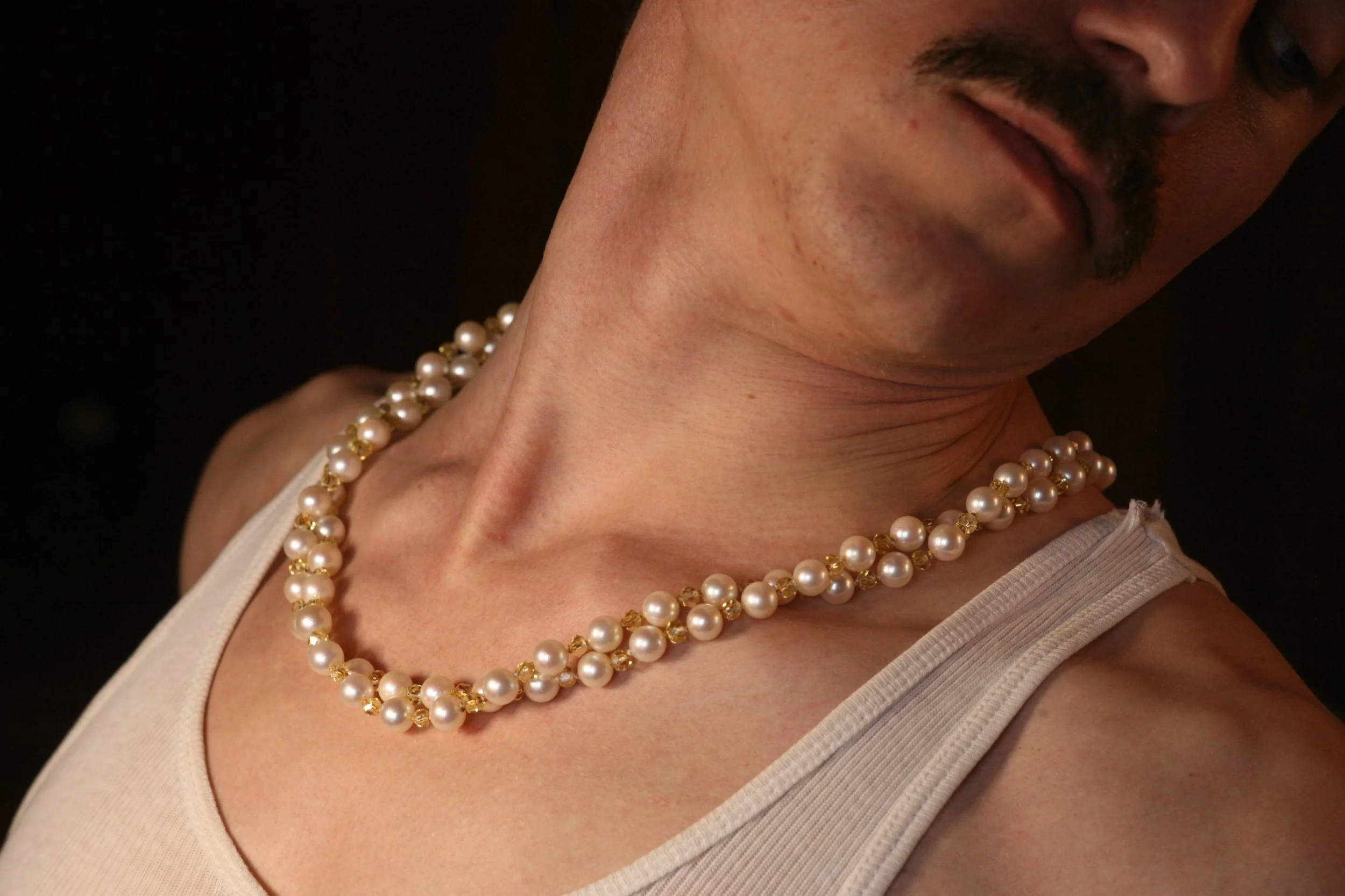 Close-up of a person wearing a pearl necklace and a white tank top, with a visible mustache and partially turned head.