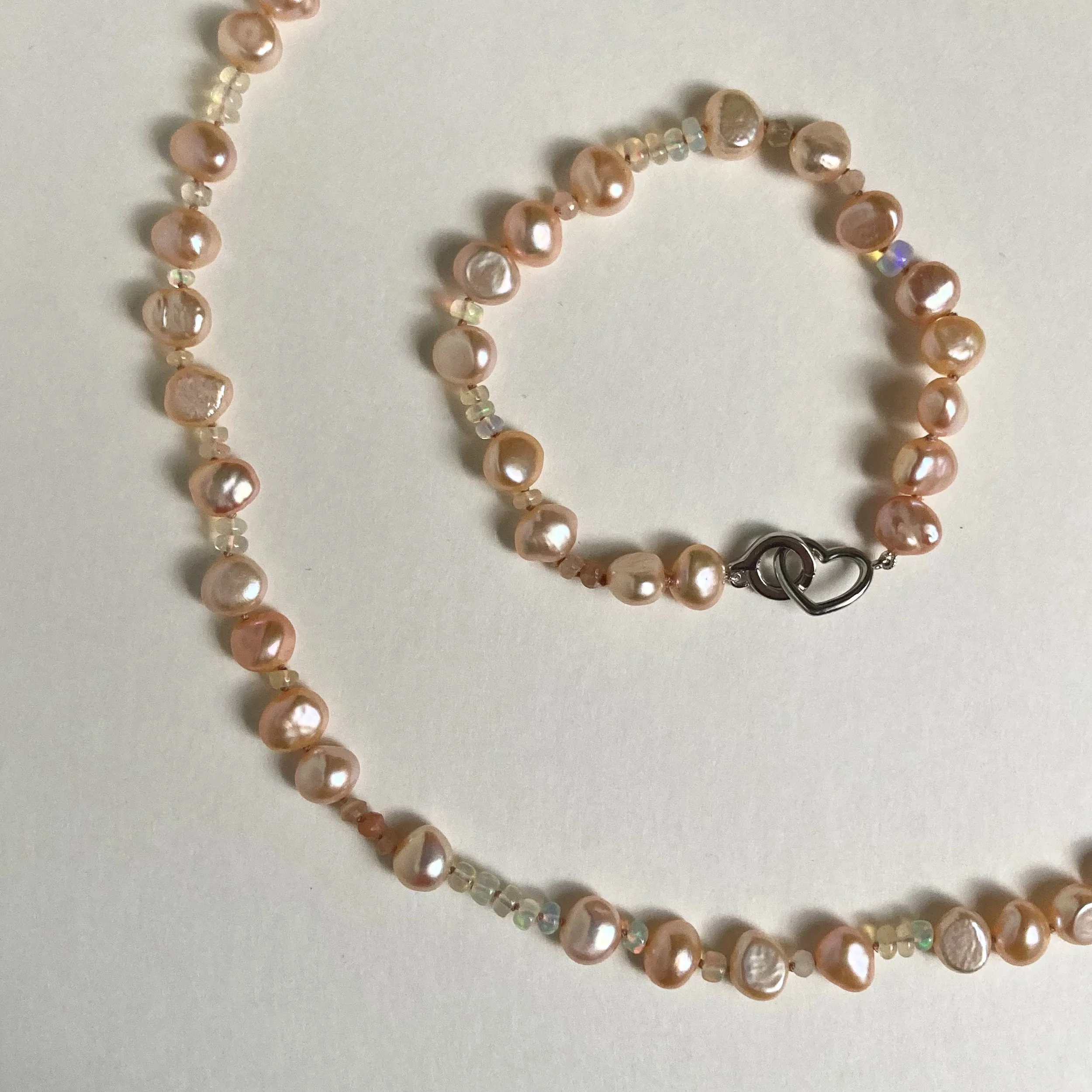 Custom restring with opal and moonstone beads, client's own pearls, and sterling silver clasp.